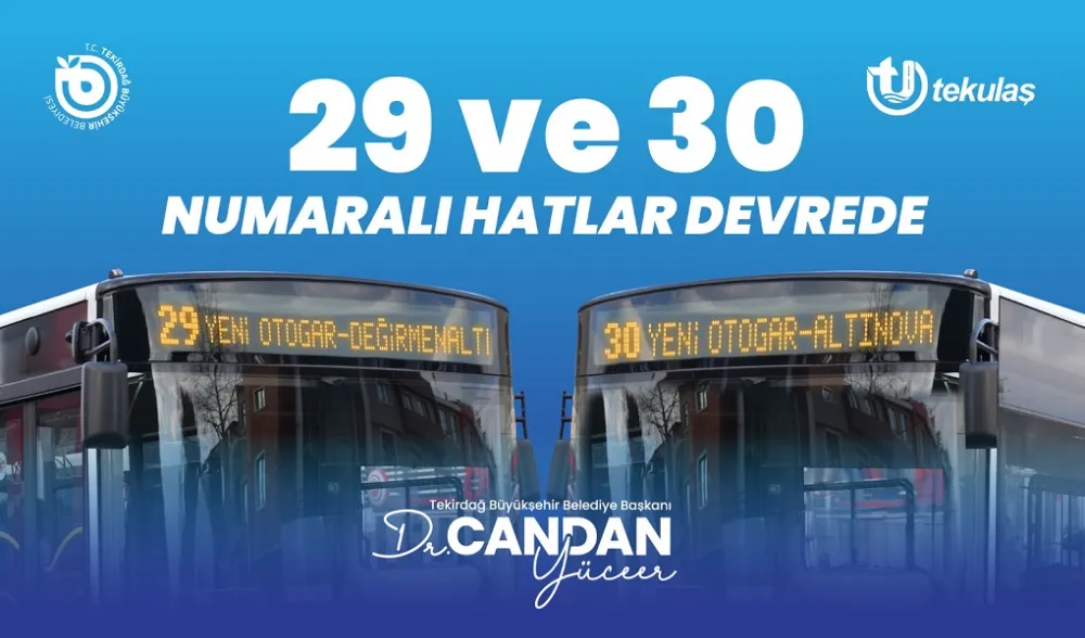 Tekirdağ Büyükşehir Belediyesi, şehiriçi ulaşımında 2 yeni hattı daha vatandaşların hizmetine sunuyor. Süleymanpaşa İlçesi’nde 29 No’lu Yeni Otogar-Altınova ve 30 No’lu Yeni Otogar-Değirmenaltı hatları Perşembe gününü Cuma gününe bağlayan gece saat 00.00’dan itibaren hizmete giriyor.