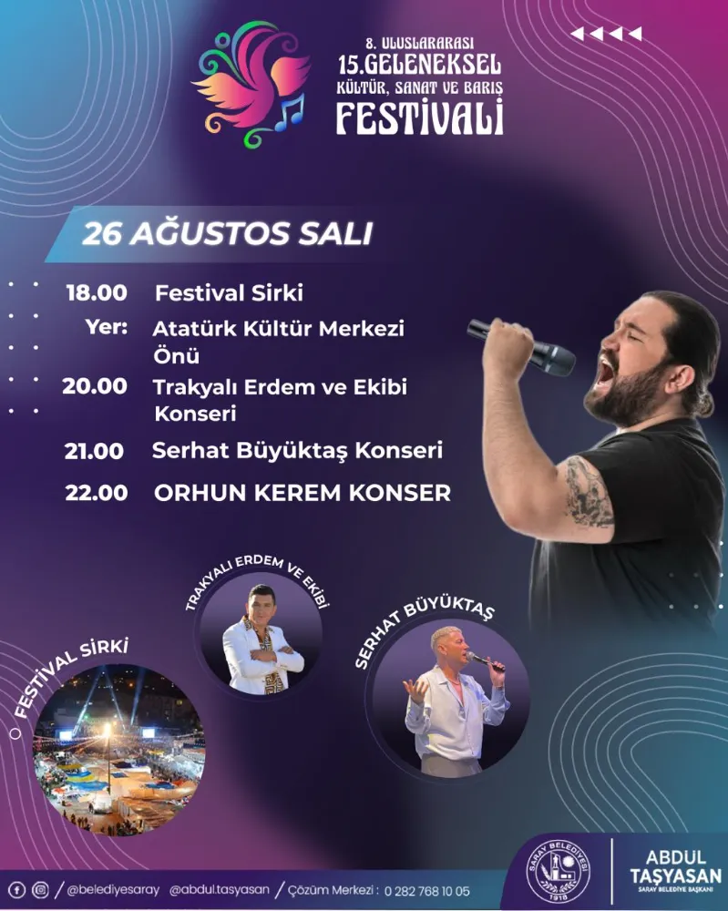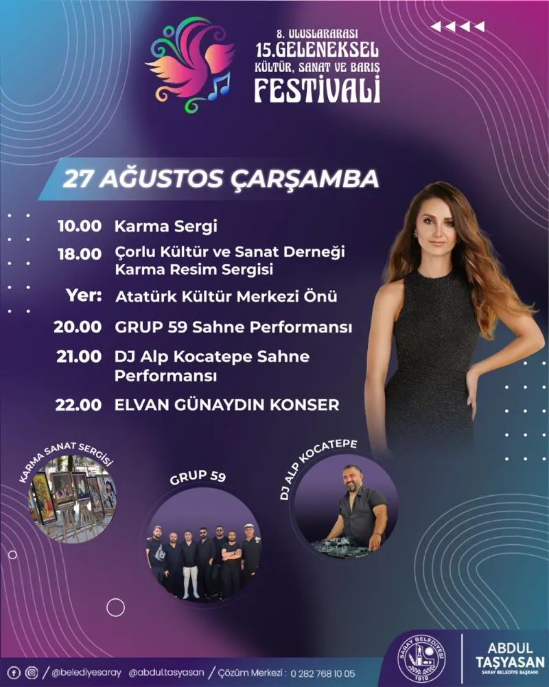 Saray Belediyesi 8. Uluslararası 15. Geleneksek Kültür, Sanat ve Barış Festivali 25 Ağustos Pazartesi günü başlıyor. Festivalin resmi açılışı 25 Ağustos Pazartesi günü saat 18.30’da Atatürk Alanı’nda gerçekleştirilecek. Festival çelenginin Atatürk Anıtı’na sunulmasıyla başlayacak olan program, kortej yürüyüşü sonrası Atatürk Kültür Merkezi önünde devam edecek. Edirne Belediye Bandosu gösterilerinin ardından DJ Mücahit sahne alacak. DJ Mücahit ardından ünlü sanatçı Ekin Uzunlar, en güzel şarkılarını Saraylılarla hep birlikte söyleyecek.