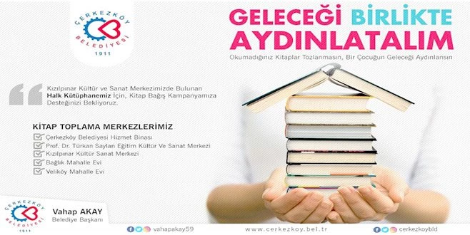 Çerkezköy Belediyesi tarafından, Kızılpınar Kültür ve Sanat Merkezi?ndeki Halk Kütüphanesi için `Geleceği Birlikte Aydınlatalım` sloganı adı altında kitap bağış kampanyası başlatıldı.