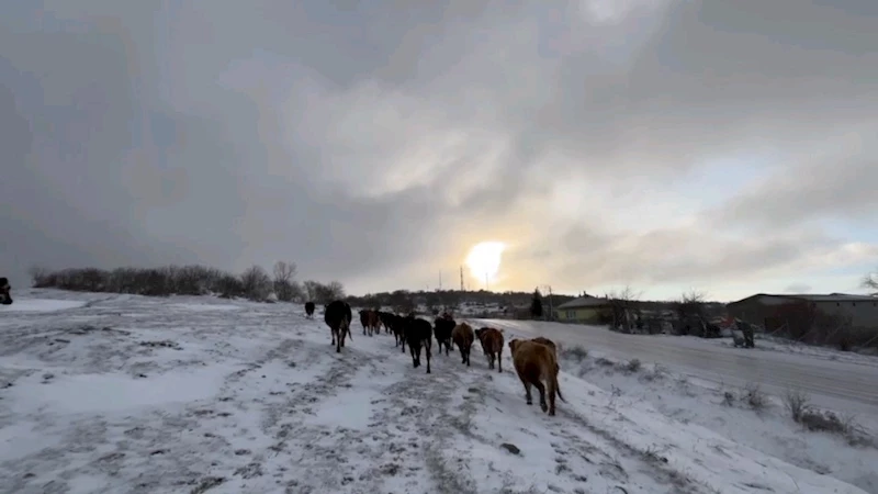 Edirne’nin özellikle kırsal kesimlerinde etkili olan kar yağışı nedeniyle güçlük çeken besiciler, tüm zorluklara rağmen geçim kaynağı olan hayvanlarını kar üzerinde besliyor. Lalapaşa ilçesi Hacı Danişment köyünde besicilik yapan vatandaşlar, zorlu kış şartlarında mesailerini sürdürüyor.