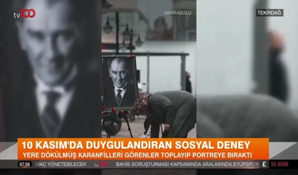 Tekirdağ Büyükşehir Belediyesi, 10 Kasım Atatürk’ü Anma Günü etkinlikleri kapsamında duygulandıran bir sosyal deneye imza attı. Vatandaşların yoğun olarak bulunduğu alanlara Atatürk portresi ve yere dökülmüş kırmızı karanfiller bırakıldı. Yerdeki karanfilleri fark eden vatandaşlar, büyük bir duyarlılıkla karanfilleri Ata’nın portresinin önüne yerleştirdi.