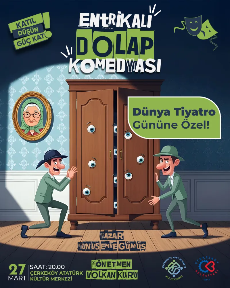 Çerkezköy’de 27 Mart Dünya Tiyatrolar Günü kapsamında özel bir etkinlik düzenleniyor. Çerkezköy Kent Konseyi ve Çerkezköy Belediyesi’nin katkılarıyla sahnelenecek olan “Entrikalı Dolap Komedyası”, tiyatro severleri bir araya getirecek.