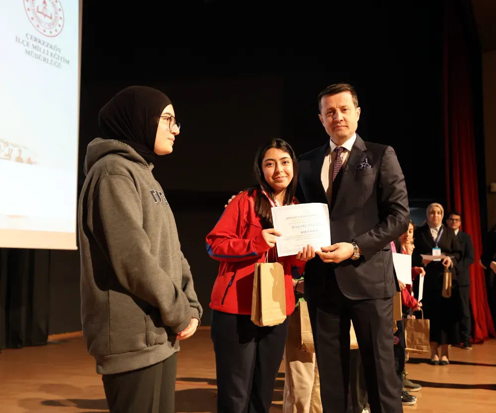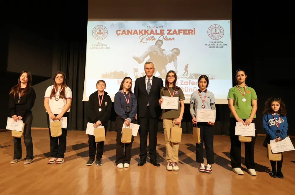 Çerkezköy Şehitliği’ndeki programının ardından tören saat 10.30’da Atatürk Kültür Merkezi’nde devam etti. Saygı Duruşu ve İstiklal Marşı’nın okunmasının Piyade Üsteğmen Ömer Özdğer tarafından 18 Mart Çanakkale Deniz Zaferi ve Şehitleri Anma konulu sunum yapıldı. Ardından Şiir Dinletisi yapıldıktan sonra Son Nefeste Vatan adlı gölge oyunu sahnelendi. Büyük beğeni ile izlenen oyunun ardından 18 Mart Çanakkale Zaferi ve Şehitleri Anma Günü etkinlikleri kapsamında düzenlenen yarışmalarda dereceye giren öğrencilere ödülleri verildi. Ödül töreninin ardından çekilen hatıra fotoğrafı ile Atatürk Kültür Merkezi’ndeki tören sona erdi.