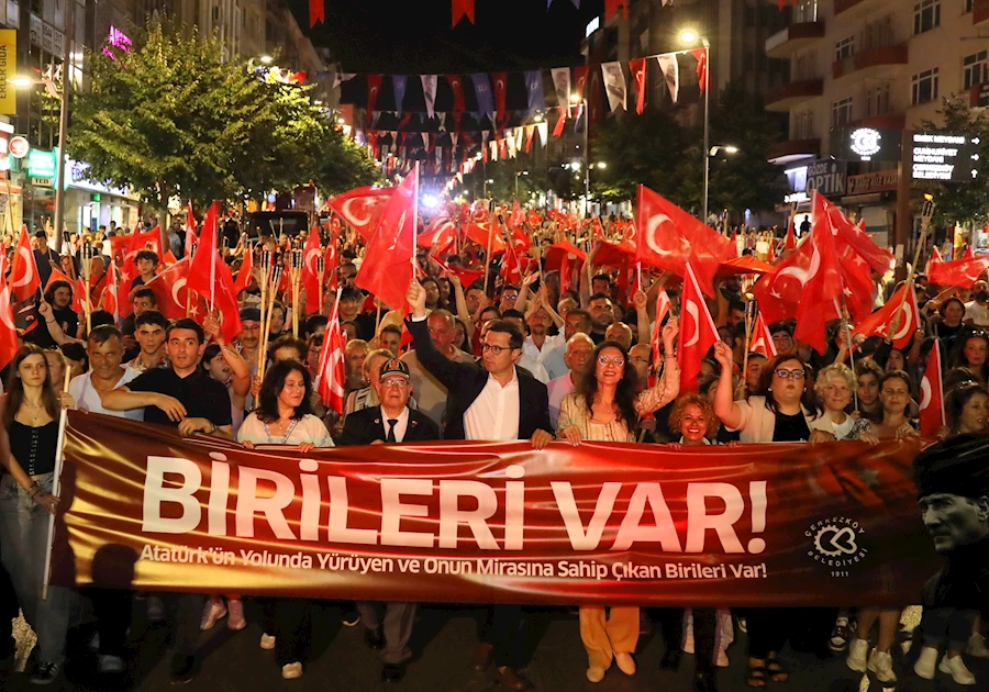 Çerkezköy Belediyesi 7. Kültür ve Sanat Festivali’nde 30 Ağustos Cumartesi günü saat 20.30’da Çerkezköy Belediyesi önünde başlayan ve Kapalı Pazar Yeri’nde sona eren Zafer Yürüyüşü ile coşku ve heyecan doruk noktasına ulaşırken, Zafer Yürüyüşüne katılan binlerce Çerkezköylü Cumhuriyet sevdalısı marşlar söyleyerek Zafer Bayramı coşkusuna ortak oldular. Zafer Yürüyüşü’ne katılan kortejin Kapalı Pazar Yeri’ne ulaşmasının ardından saygı duruşu yapıldı ve İstiklal Marşımız hep bir ağızdan coşku ile söylendi. Günün anlam ve önemine ilişkin video ve slayt gösterilerinin ardından sahneye çıkan Belediye Başkanı Vahap Akay, 30 Ağustos Zafer Bayramı’nın 103. Yılı nedeni ile coşku dolu bir konuşma gerçekleştirdi.