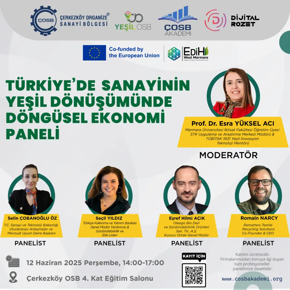 Türkiye'nin beş Avrupa Dijital İnovasyon Merkezi'nden (ADİM) biri olan EDIH WEST MARMARA Avrupa Birliği Projesi konsorsiyum üyesi Çerkezköy Organize Sanayi Bölgesi (ÇOSB), bölgenin yeşil dönüşümüne liderlik edecek önemli bir etkinliğe ev sahipliği yapıyor. 12 Haziran Perşembe günü düzenlenecek olan 'Türkiye’de Sanayinin Yeşil Dönüşümünde Döngüsel Ekonomi' paneli, konuyla ilgili tüm kilit paydaşları bir araya getirecek.