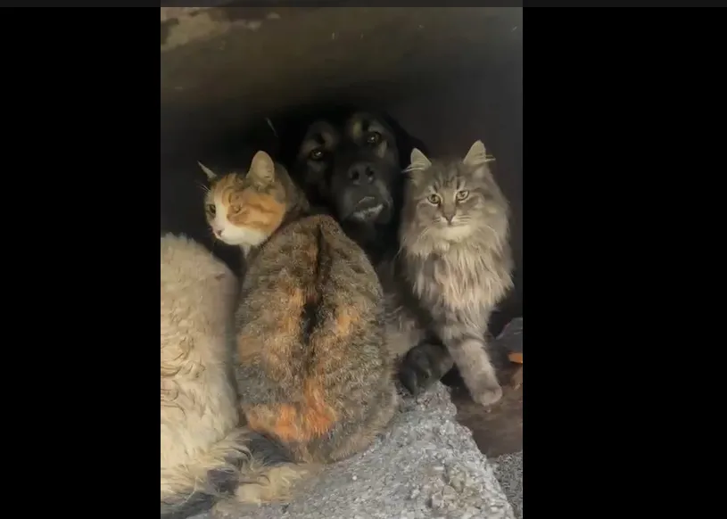 Soğuktan üşüyen sokak kedileri, bir köpeğin kulübesinde yanına sokularak ısınmaya çalıştı. Birbirine sokulmuş halde duran kedilerle köpeğin oluşturduğu bu görüntü, görenlerin içini ısıttı. Farklı türden hayvanların zorlu hava şartlarında sergilediği bu dayanışma, insanlığa da anlamlı bir mesaj verdi.