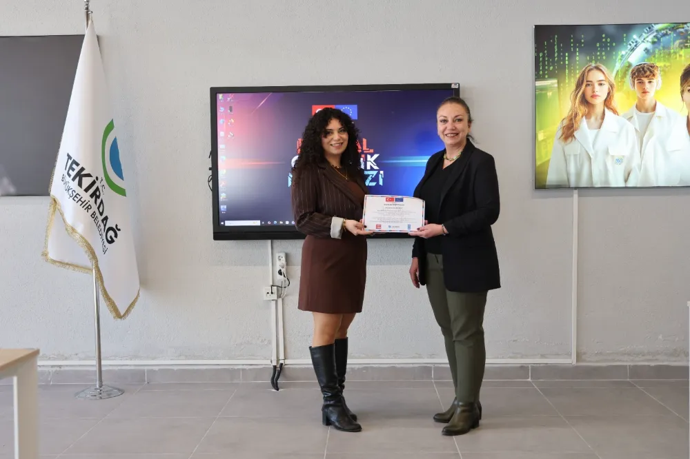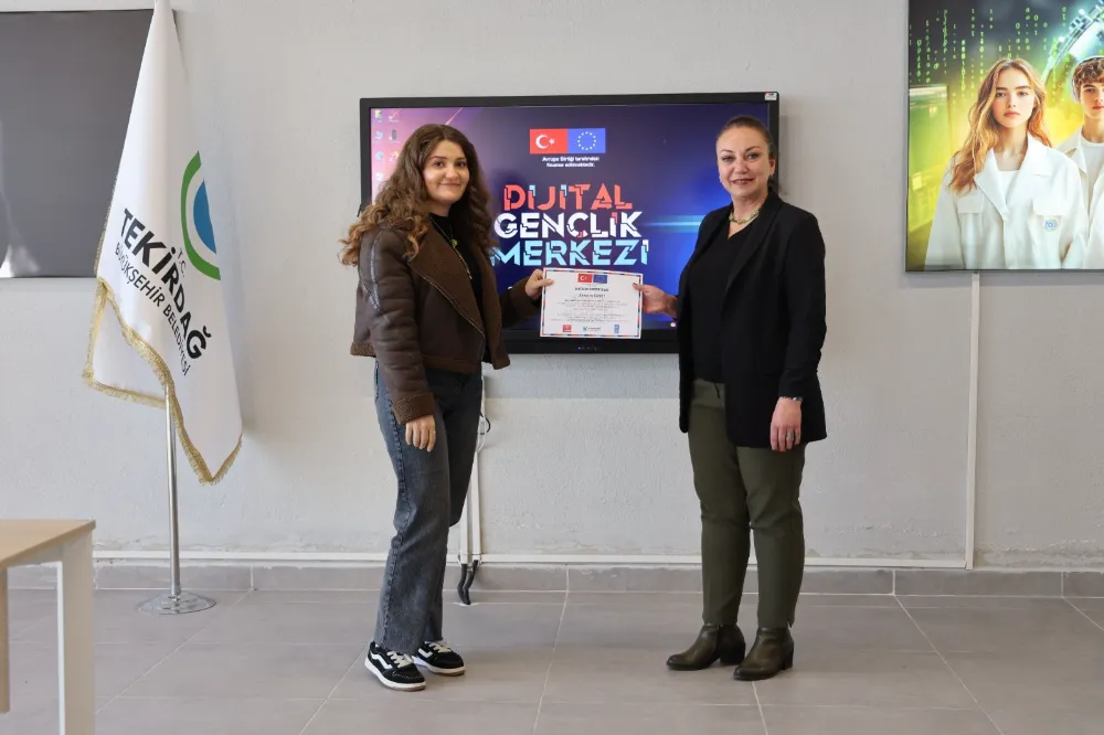 Eğitim programı sonunda belirlenen başarı kriterlerini sağlayan kursiyerlere, Tekirdağ Büyükşehir Belediyesi Kültür, Sanat ve Sosyal İşler Dairesi Başkanı Nilüfer Ayça Albayraktar tarafından, Avrupa Birliği, Birleşmiş Milletler Kalkınma Programı (UNDP), Türkiye Belediyeler Birliği ve Tekirdağ Büyükşehir Belediyesi logolarını taşıyan katılım sertifikaları takdim edildi.
