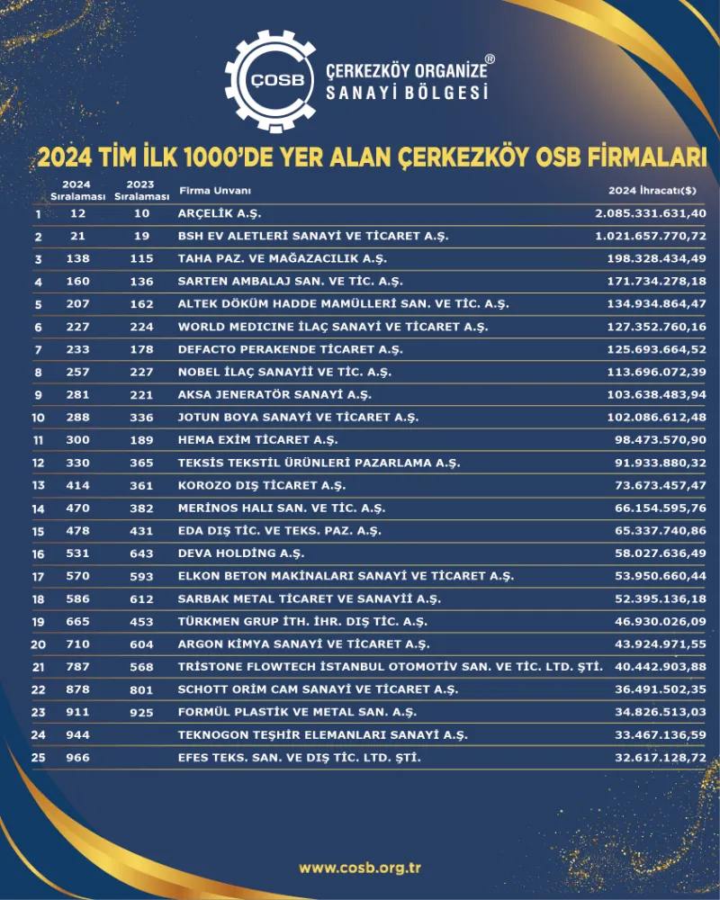 ÇOSB’Den 25 firma TİM’in en büyük 1000 ihracaatçı-2024 listesinde yer aldı.