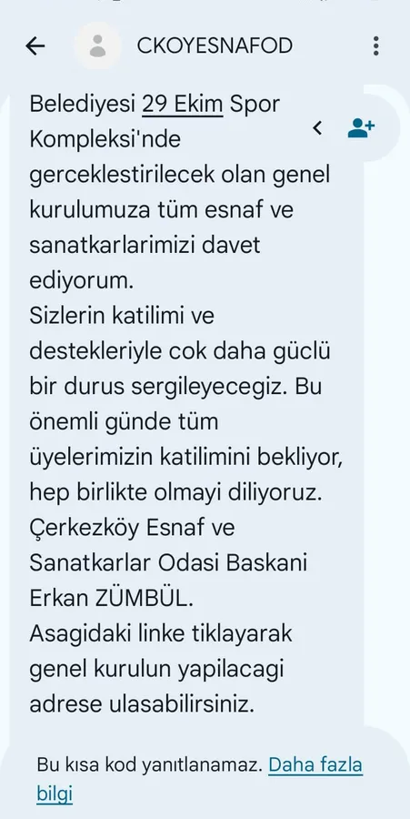 “Değerli esnaflarım, hepinize hayırlı haftalar diliyorum. 10 Ocak Cumartesi günü saat 13.00'te, Çerkezköy Belediyesi 29 Ekim Spor Kompleksi'nde gerçekleştirilecek olan genel kurulumuza tüm esnaf ve sanatkârlarımızı davet ediyorum. Sizlerin katılımı ve destekleriyle çok daha güçlü bir duruş sergileyeceğiz. Bu önemli günde tüm üyelerimizin katılımını bekliyor, hep birlikte olmayı diliyoruz.