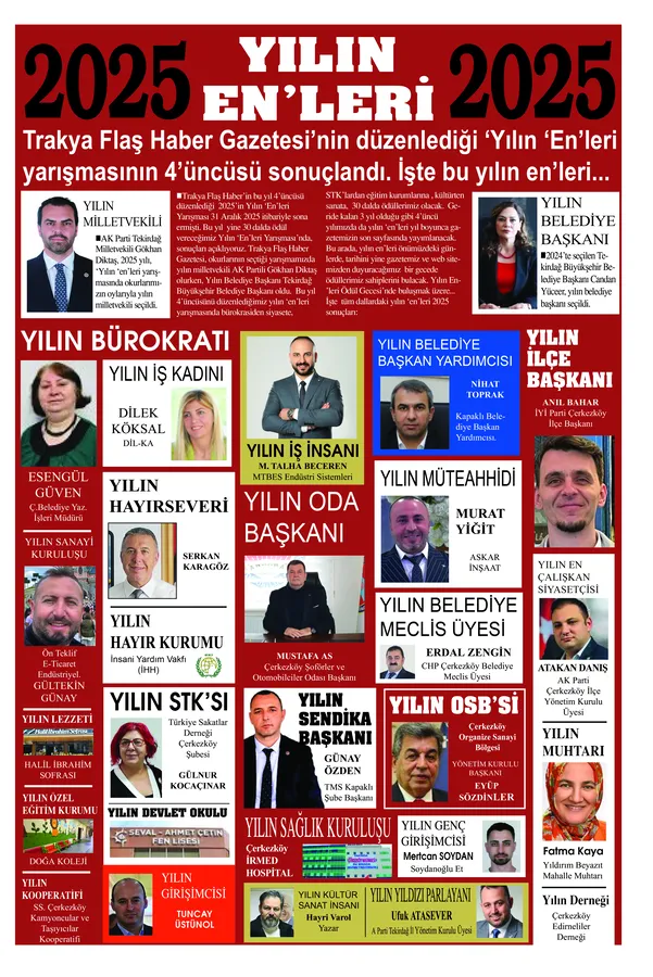 Trakya Flaş Haber’in bu yıl 4’nücüsünü düzenlediği 2025’in Yılın ‘En’leri Yarışması 31 Aralık 2025 itibariyle sona ermişti. Yılın ‘en’lerin bu sayımızda açıklıyoruz…