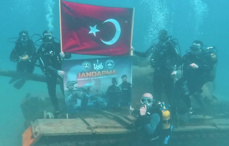 Jandarma teşkilatının 186. kuruluş yıldönümü, Saros Körfezi’nde Tekirdağ İl Jandarma Komutanlığı ekipleri tarafından, Gökçetepe köyü sahili açıklarında batırılan tanka yapılan dalış ile kutlandı.