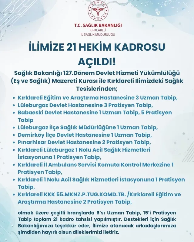 Sağlık Bakanlığı 127. Dönem Devlet Hizmeti Yükümlülüğü (Eş ve Sağlık) Mazereti Kurasında Kırklareli’ndeki sağlık tesislerine toplam 21 hekim kadrosu tahsis edildi.