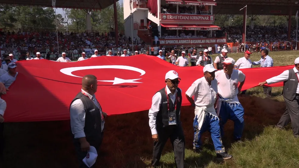 Ağalık ihalesinin ardından hakemler ve güreşseverlerin taşıdığı Türk bayrağı er meydanında dolaştırıldı. Tribünlerde bulunanlar Türk bayrağını ayakta selamladı.
