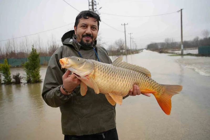 Edirne’de Meriç Nehri’nin taşmasının ardından bir vatandaşın tarlasında ortaya çıkan yaklaşık 7 kilogramlık sazan balığı, taşkının bıraktığı ilginç görüntülerden biri oldu.