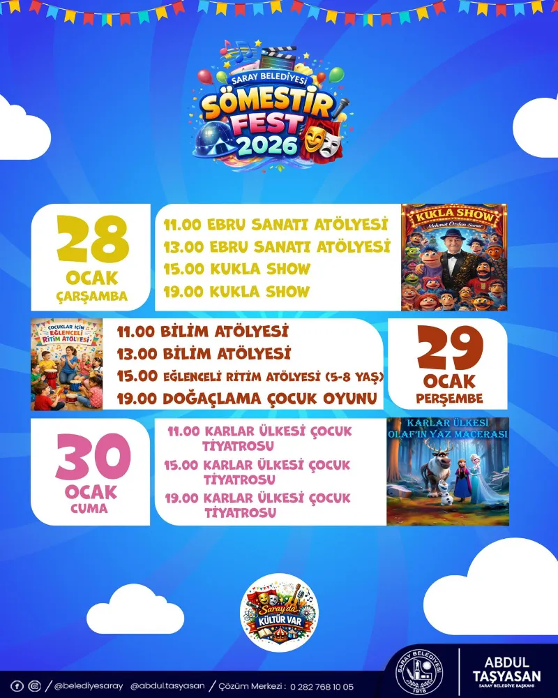 Saray Belediyesi, yarıyıl tatilini verimli ve keyifli geçirmek isteyen çocuklar için Sömestir Fest 2026’yı hayata geçiriyor. On dört gün sürecek festival boyunca çocuklar, eğlence ve eğitimi bir arada yaşayacakları zengin bir etkinlik programıyla buluşacak.