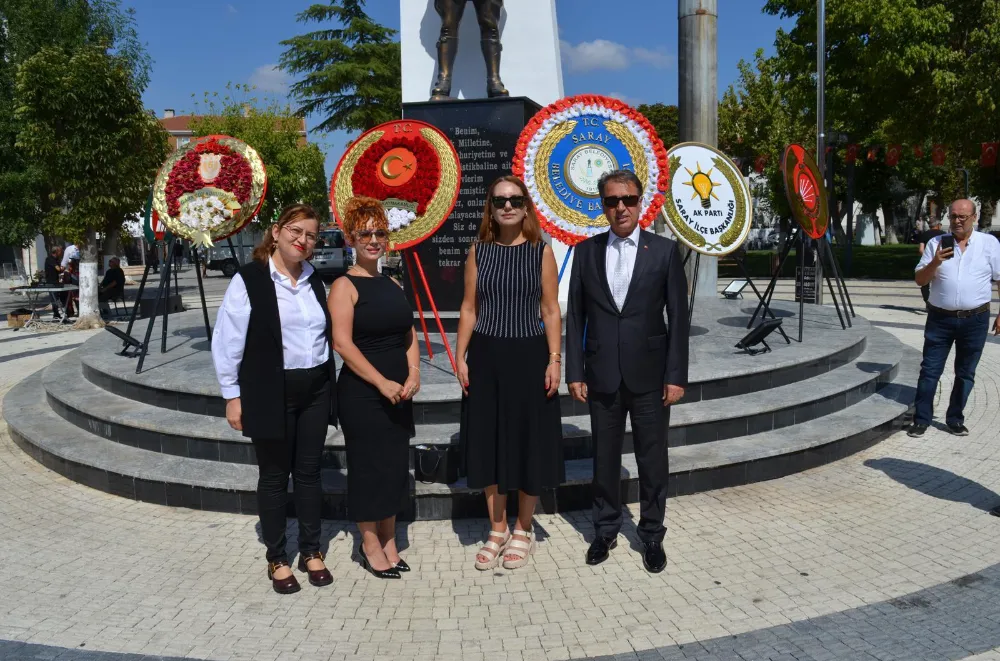 Saat 10.00’da Atatürk Alanı’nda Saray Kaymakamlığı, Garnizon Komutanlığı ve Saray Belediye Başkanlığı çelengi Atatürk Anıtı’na sunuldu.