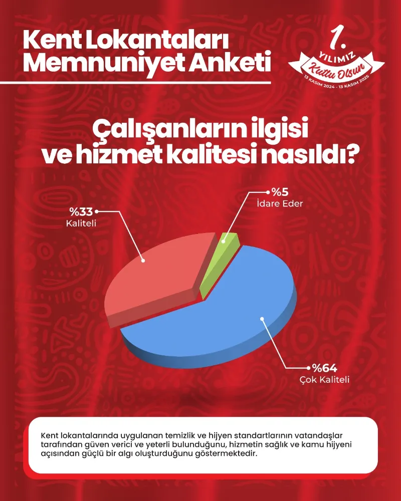 Kent Lokantaları’nda hizmet sunan personelden memnuniyet oranı rekor düzeyde gerçekleşti. “Çalışanların ilgi ve hizmet kalitesi nasıldı?” sorusuna katılımcıların yüzde 64’ü “çok kaliteliydi”, yüzde 33’ü “kaliteliydi” yanıtını verdi.