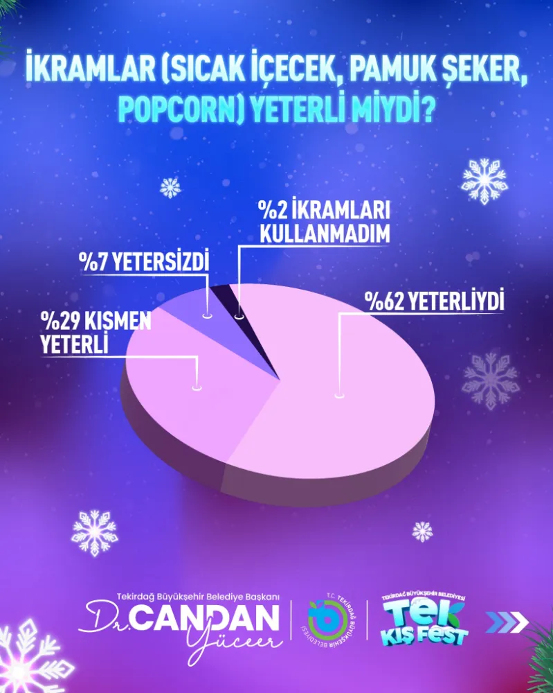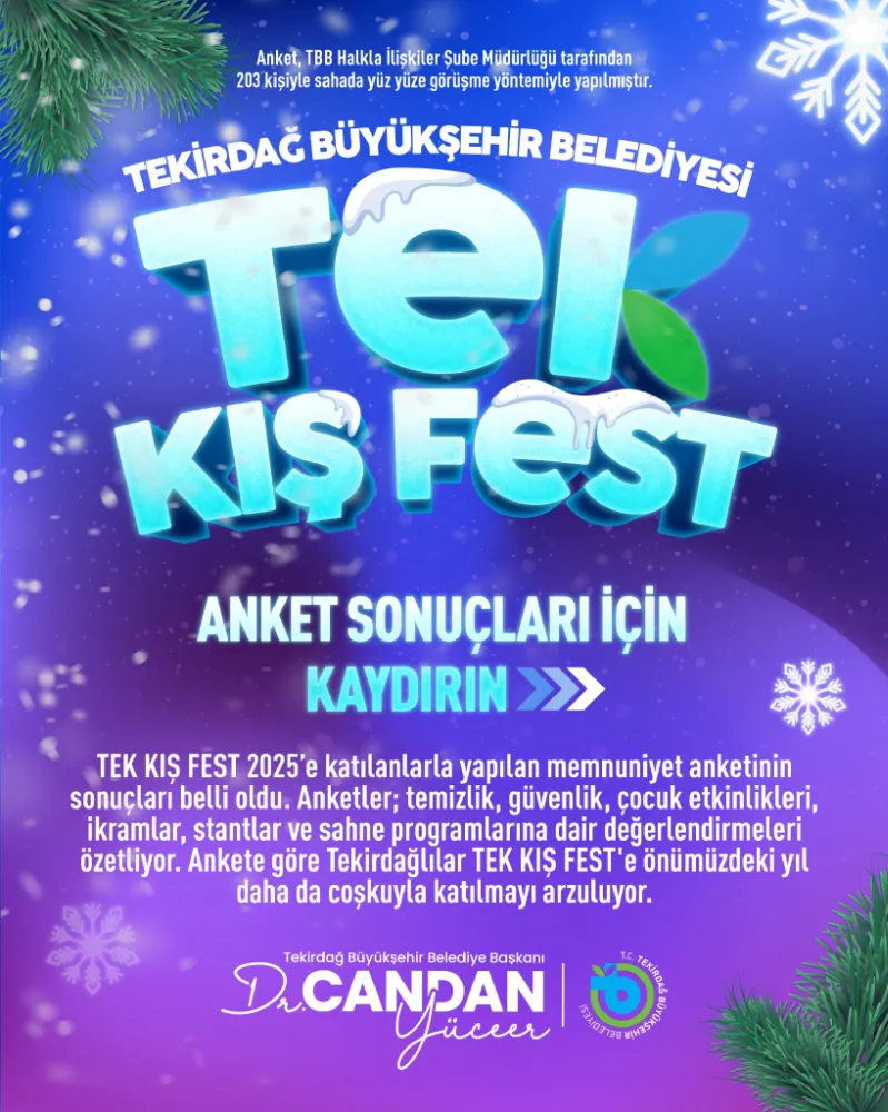 Tekirdağ Büyükşehir Belediyesi tarafından düzenlenen "TEK Kış Fest", kentin sosyal yaşamına damga vurdu. Etkinlik sonrası gerçekleştirilen memnuniyet anketi, vatandaşların festivale olan yoğun ilgisini ve memnuniyetini gözler önüne serdi. Katılımcıların yüzde 96’sı tek bir ağızdan aynı cevabı verdi: "TEK Kış Fest her yıl düzenlensin!"