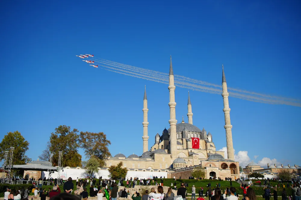 Mimar Sinan’ın eşsiz şaheseri Selimiye Camii üzerinde akrobatik manevralar yapan Türk Yıldızları, gökyüzünü adeta kırmızı beyaza boyadı. Yaklaşık yarım saat süren gösteride ay yıldızlı jetlerin senkronize uçuşları, meydanı dolduran binlerce Edirneli tarafından büyük beğeniyle izlendi. Vatandaşlar gökyüzündeki gösteriye alkışlarla eşlik ederken, ellerindeki Türk bayraklarıyla pilotlara sevgi gösterisinde bulundu. Gösteriyi izleyenler, bu tarihi anı cep telefonlarıyla kaydederek ölümsüzleştirdi.