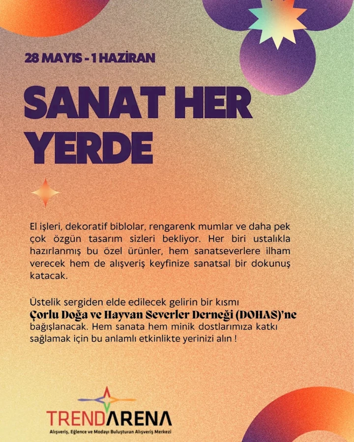 Çorlu’nun iki büyük alışveriş merkezinden biri olan Trend Arena AVM; sanatı görmek, hissetmek ve iyiliğe katkı sağlamak için tüm misafirlerini Sanat Her Yerde etkinliğine davet ediyor.