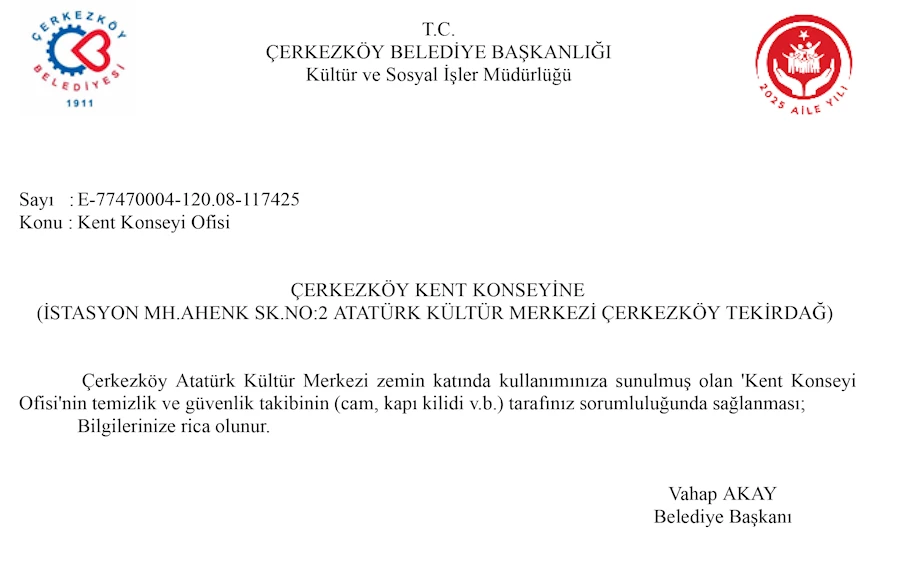 Çerkezköy Atatürk Kültür Merkezi zemin katında kullanımınıza sunulmuş olan 'Kent Konseyi Ofisi'nin temizlik ve güvenlik takibinin (cam, kapı kilidi v.b.) tarafınız sorumluluğunda sağlanması; Bilgilerinize rica olunur.