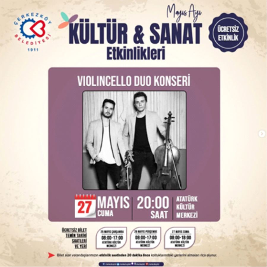 Çerkezköy Belediyesi harika bir müzik şölenine ev sahipliği yapmaya hazırlanıyor. 27 Mayıs Cuma günü saat 20:00’de Çerkezköy Atatürk Kültür Merkezi’nde Keman Sanatçısı Doğu Kaptaner ve Viyolonsel Sanatçısı İsmail Kaya'nın kurduğu Violincello duo konseri yerli, yabancı, sıra dışı ve yepyeni düzenlemeler ile dinleyicilere muhteşem bir gece yaşatacak.