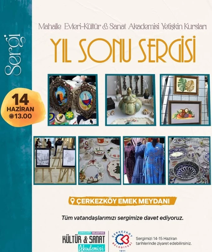 14 Haziran Cumartesi günü saat 13.00’te Çerkezköy Emek Meydanı’nda açılışı gerçekleşecek yıl sonu sergisi 14-15 Haziran tarihleri boyunca ziyaretçileriyle buluşmaya devam edecek.