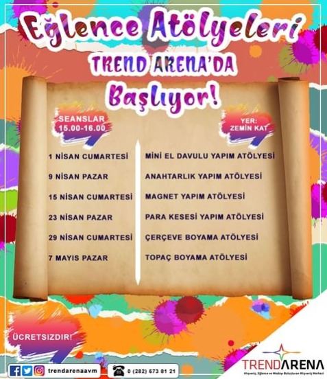 Çorlu’nun iki büyük AVM’sinden biri olan Trend Arena AVM, çocuklar için eğlenceli atölyeler yapmaya devam ediyor. Trend Arena AVM; 9 Nisan Pazar Anahtarlık Yapım Atölyesi, 15 Nisan Cumartesi Magnet Yapım Atölyesi, 23 Nisan Pazar Para Kesesi Yapım Atölyesi, 29 Nisan Cumartesi Çerçeve Boyama Atölyesi ve 7 Mayıs Pazar Topaç Boyama Atölyesi etkinlikleriyle 4 yaş ve üzeri minik misafirlerini ağırlıyor.