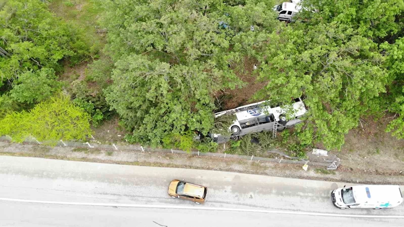 Ekipler bir yandan kaza bölgesinde çalışmalarını sürdürürken ağaçlık alana devrilen otobüs, havadan dron ile görüntülendi.