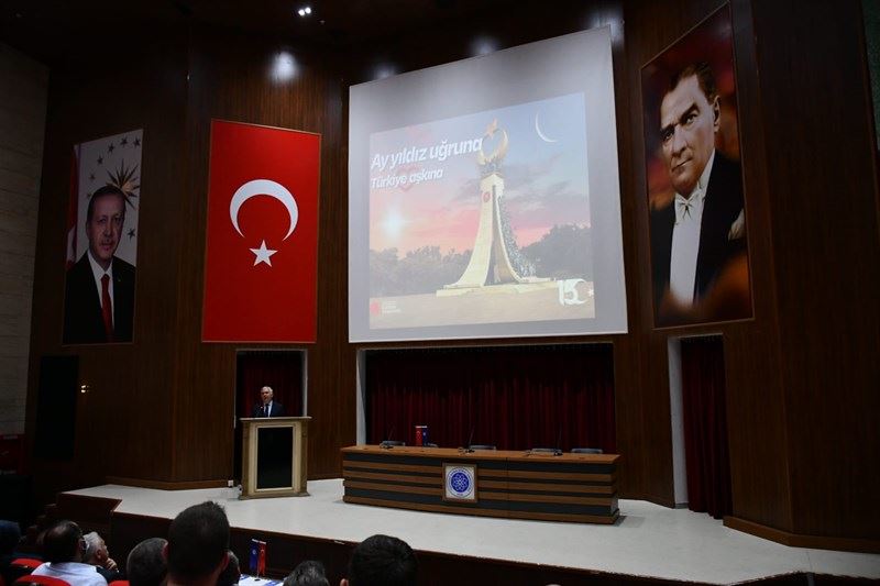 Rektör Yardımcısı Vatandaş konferansında şu ifadelere yer verdi; “Bu ve benzeri toplantıların birçok amacından bahsedilebilir. Hiç kuşkusuz bugünkü bu toplantımızın şu 3 amacı kapsadığı inancı ve görüşündeyim. Bu topraklardan bu ülkede yaşıyor olmanın gerektirdiği teyakkuz halinde bulunmanın önemini fark etmek ve gereğine uygun olmak. Bu toprakların bu seneki konseptinde dile getirildiği üzere Türkiye aşkının sıradan bir sevda veya duygu olmadığını bilincine ermek ve bu bilincin diri tutulmasına katkı sağlamak. 6 yıl önceki Türkiye’yi işgal girişimi karşısında korkmayan, sinmeyen, evine kapanmayan tüm bunların yerine Kutul Emare’de Çanakkale’de ve benzerinde hep yapageldiği üzere bedenini tanka füzeye jete, mermiye engel kılarak müstesna bir millet olduğunu ispatlayan bu kutlu milletin şehitlerini bir kez daha minnetle saygıyla anmak gazilerine hayırlı, uzun ömürler dilemek amacıyla bir araya geldik.” dedi.