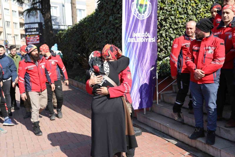 Karşılama sırasında kısa bir konuşma yaparak duygularını paylaşan İNDAK ekip sorumlusu Varol Yılmaz bölgede yaşadıklarını ve düşüncelerini paylaştı. Yaşanan afetin çok büyük bir afet olduğuna dikkat çeken Yılmaz, “Herkese çok teşekkür ediyorum. Bizler böyle karşılayarak onurlandırdınız. Yıllardır İnegöl’de afet bilincini oluşturmaya, arama-kurtarmanın önemini anlatmaya çalışıyoruz. Keşke bu acı olay yaşanmasaydı da bu farkındalığı daha önce hissetseydik, anlasaydık. Gerçekten yaşanan afet çok büyük bir afet. Geçmişte yaşanan afetler gibi lokal bir afet değil. Bir Van depremi, bir İzmir, Gölcük depremi gibi değil. Çok geniş bir alandaydı. İnşallah bundan sonra yaşanmasını umut etmiyoruz ama coğrafi olarak çok sıkıntılı bir bölgede yaşadığımızı unutmayalım. Hazırlıklarımızı daha da ilerletelim istiyoruz. Bir hayata dokunmak, bir yaşamın devamına vesile olmak çok güzel bir şey. Allah nasip etti 13 vatandaşımızı enkazdan çıkardık, hayata dönmesine vesile olduk. 99 vatandaşımızın naaşlarını çıkardık. Onları ailelerine teslim ettik. O da ayrı bir şey. İnsanlar umutla bekliyorlar. Dün umutların tükendiği 222. saatte Melike İmamoğlu ablamızı canlı olarak çıkardık. Allah’a çok şükür. Rabbim bir daha böyle afetler yaşatmasın” dedi.