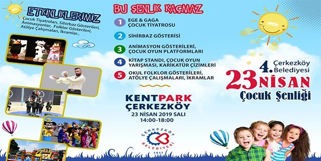 23 Nisan Ulusal Egemenlik ve Çocuk Bayramı nedeniyle Çerkezköy Belediyesi 4. Çocuk Şenliği`ni düzenleyecek. Şenlik, 23 Nisan Salı günü 14.00-18.00 saatleri arasında Çerkezköy Kentpark?ta yapılacak.