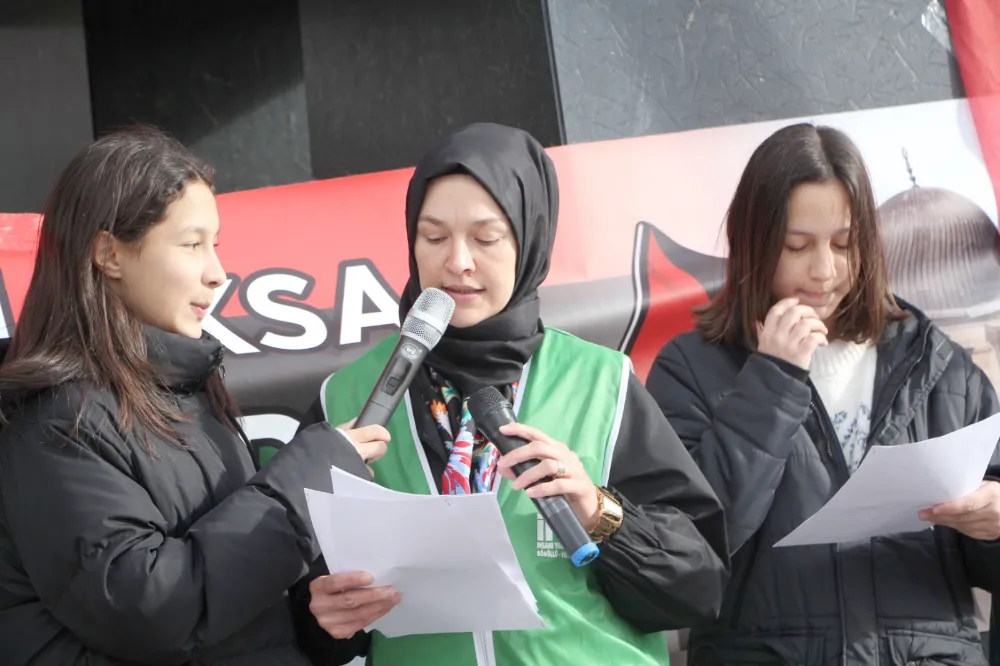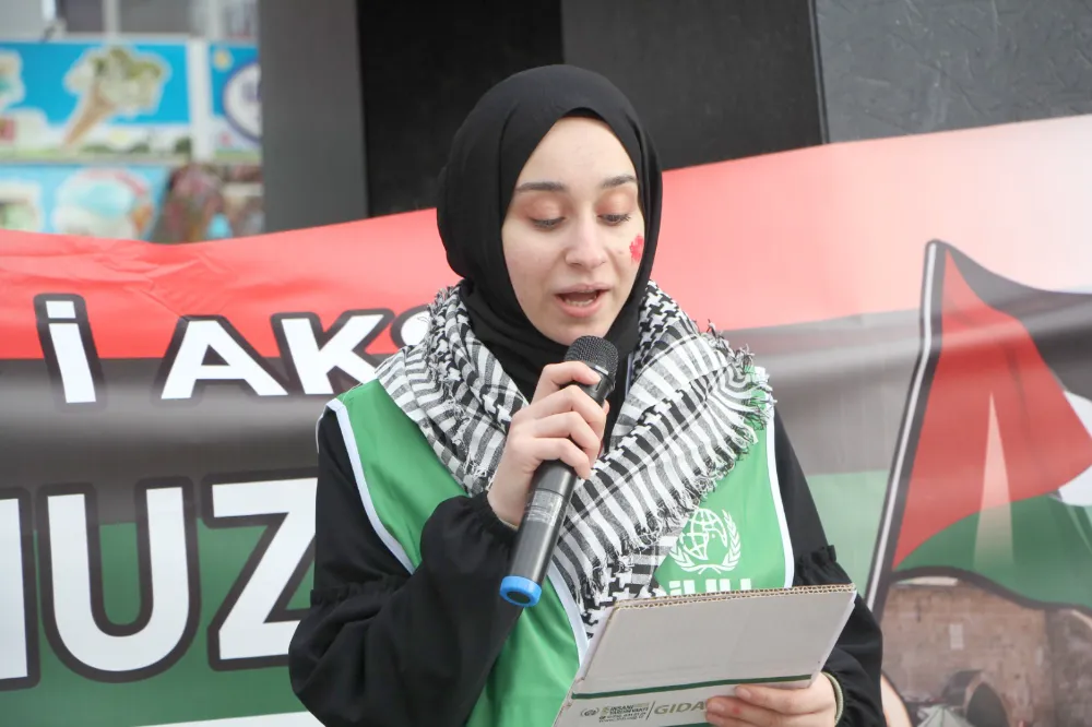 “Biz Filistinli çocuklar adeta ölüme doğuyoruz. Bizler ülkemizde geleceğe dair planlar yapamıyoruz. Nereden ne zaman katil İsrail’in hedef gözetmeyen bir bombasıyla karşılaşacağımızı bilmeden yaşıyoruz. Şimdilerde çoğumuz sıcacık anne kucağına hasret hayata tutunmaya çalışıyoruz. Yavrularımızı anne şefkatiyle bağrımıza basacağımız, kokularını içimize çekeceğimiz yerde onların cansız bedenlerini taşıyor, kan ve barut kokusundan başka bir koku alamıyoruz. Daha önce bu meydanlarda haykırdığımız üzere Katil İsrail, dini, insani ve uluslararası hukuku hiçe sayarak kadın, çocuk, sivil hedef gözetmeksizin katliam ve soykırımına devam ediyor.