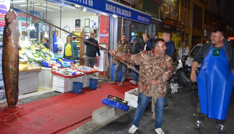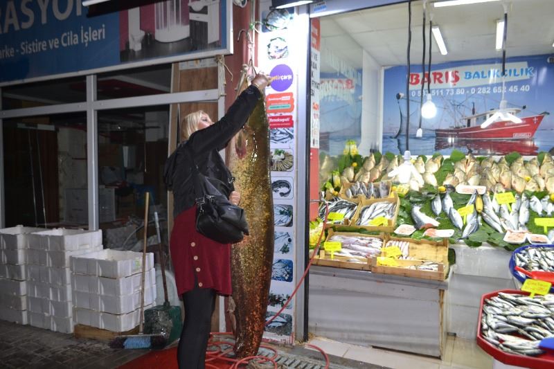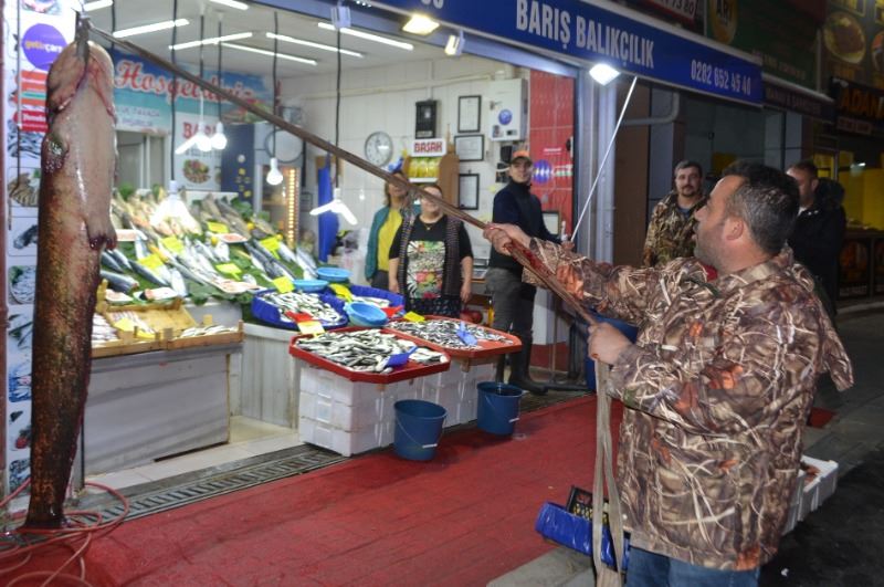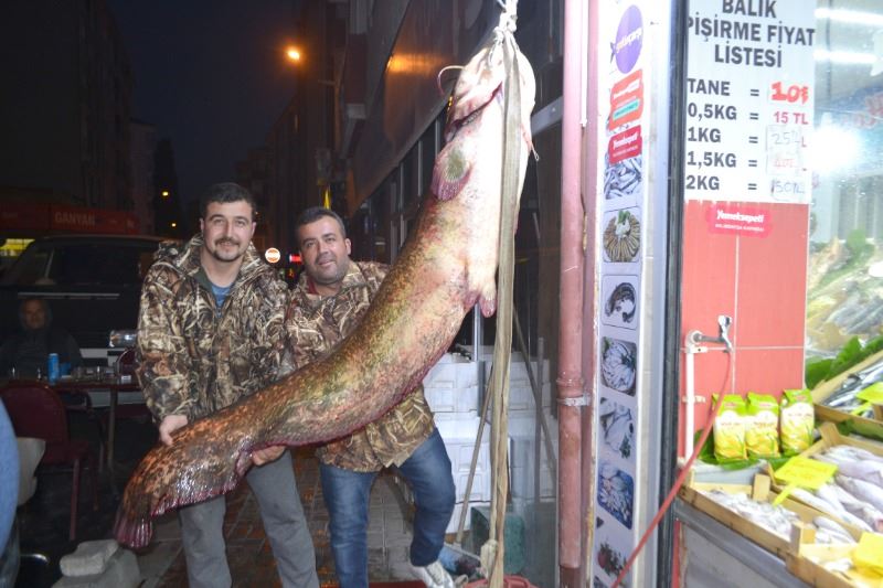 Meriç Nehri’nde balıkçıların oltasına takılan ve 5 kişi tarafından zor yakalanan 2 metreye yakın 90 kiloluk yayın balığı, Çorlu Şeyh Sinan Mahallesi Şehit İrfan Atasayar Sokak üzerindeki bir balıkçıda tezgaha konuldu.