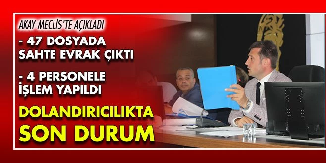 Meclis`te konuşan Başkan Akay, 47 dosya sahibinden 10 tanesinin kendilerinin araması sonrasında gelerek sahte tahsilat fişleriyle yapılan ödemeleri gerçek ödemelere çevirdiklerini belirtirken, belediyenin kasasına parası girmeyen dosya sayısının 37`ye düştüğünü kaydetti. Akay,  "47 dosya parasını yatırmamış muhtemelen başkalarına verdikleri düşünüyorlar. Tamamı ruhsat ve yapı sahiplerine şu tarihlerde almış olduğunuz dosyanızda belgelerin sahte olduğu tespit edilmiştir. Sahte evrakları Çerkezköy Cumhuriyet Savcılığına teslim edilmiştir. Eksik yatan ruhsat ve iskan bedelleri yatırılmasını aksi taktirde iptal edileceğini ruhsat sahipleriyle paylaştık. 10 tanesi Çerkezköy Belediyesi`nin kasasına yatırmışlardır. 37 dosyanın Çerkezköy Belediyesi`nin kasasına yatırılmasını bekliyoruz. Sonuçta kamunun kasasına yatması gereken paraların bu konudaki eksikliklerin tamamlanmasını ruhsat sahiplerine yatırmaları konusunda bilgi verildi. "dedi.