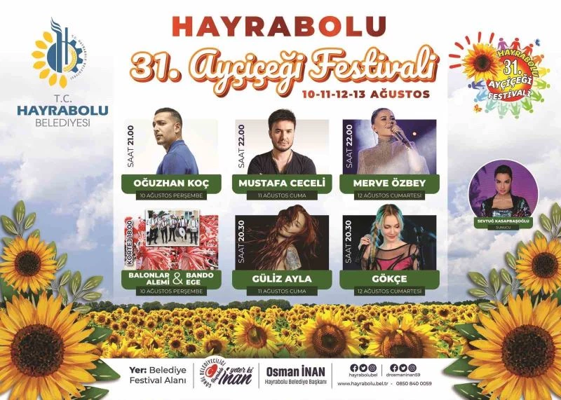 Tekirdağ Hayrabolu Belediyesi tarafından bu yıl 31’incisi düzenlenecek Ayçiçeği Festivali’nin sanatçıları belli oldu.