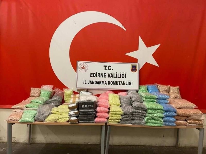 Alınan bilgiye göre, Edirne Cumhuriyet Başsavcılığı tarafından yürütülen soruşturma çerçevesinde, İl Jandarma Komutanlığı ekiplerince uyuşturucu imal ve ticareti suçunu işleyen organize suç örgütüne yönelik 4 ayrı operasyon gerçekleştirildi. Operasyonda 456 kilogram 1 milyon 800 bin adet extacy uyuşturucu hap, 36 kilogram kokain, 2 kilogram metamfetamin,732 gram reçine esrar, 9 tüp likit esrar, 3 kilogram skunk ele geçirildi. Olayla ilgili 5 şüpheli şahıs yakalanarak adli makamlarca tutuklandı.