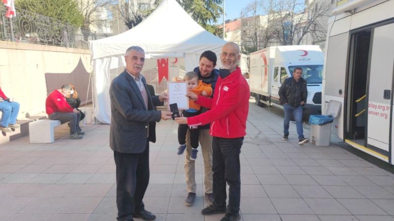 Doktor Erhan Aksoy tarafından yapılan açıklamada, “Kan acil değil, sürekli bir ihtiyaçtır. Bağışlamış olduğunu kan ile 3 kişiye hayat veriyorsunuz. Özellikle pandemi sürecinde insanların bağış alışkanlıklarının birazcık düşmeler yaşandı. Soğuk havaların etkisiyle de stoklarımızda ciddi düşüşler yaşandı. O yüzden de bu dönemde tüm vatandaşlarımızı kan bağışı özellikle daha da duyarlı olmaya davet ediyoruz. İsmail beye madalyasını takdim ettik. Kendisini tebrik ediyorum” şeklinde konuştu.