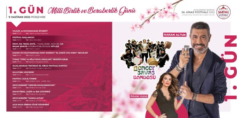 9 Haziran 2022 Perşembe günü saat 10.00’da Tekirdağ Valisi Aziz Yıldırım ziyareti ile başlayacak olan Kiraz Festivali, saat 12.00’da festivalin doğuş yeri olan Naip Mahallesi’nde yapılacak geleneksel açılış töreni ile start alacak. Saat 14.30’da sahil dolgu alanda kurulacak olan Kültür Çadırında Türk Uçak Sanayii Anonim Ortaklığı (TUSAŞ) Genel Müdürü Prof. Dr. Temel Kotil’in katılımı ve ünlü sunucu Başak Şengül’ün moderatörlüğü ile Türkiye’nin teknoloji üretimi konusunda bir söyleşi gerçekleştirilecek. Yine saat 17.00’da TUSAŞ Yerli ve Milli Hava Araçları Sergisi’nin açılışı yapılacak.