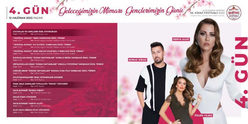 Tekirdağ Süleymanpaşa Belediyesi tarafından organize edilen ve bu yıl 56’ncısı düzenlenecek olan Uluslararası Tekirdağ Kiraz Festivali, 9-12 Haziran 2022 tarihleri arasında gerçekleştirilecek. Çok sayıda etkinliğe ev sahipliği yapacak olan 56. Uluslararası Tekirdağ Kiraz Festivali’nin programı belli oldu.