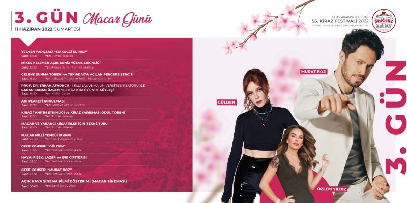 Macar Günü olarak planlanan üçüncü gün etkinlikleri, saat 10.00’da Macar Prensi Ferenc Rakoczi’nin adının verildiği Rakoczi Kupası Yelken Yarışları ile başlayacak. Yine Rakoczi’nin en yakın dostu ve Tekirdağ’daki sürgün günlerindeki yoldaşı Mikes Kelemen anısına Açık Deniz Yüzme Etkinliği saat 10.30’da başlayacak. Alkaya Sahili’nden başlayan etkinlik, Rumeli İskelesi’nde son bulacak. Saat 13.00’da Rakoczi Müzesi’nde çelenk sunma töreni düzenlenecek. Müzede Tekirdağ’a Açılan Pencere isimli fotoğraf sergisi açılacak. Kültür Çadırı etkinlikleri çerçevesinde saat 14.30’da Milli Savunma Üniversitesi Rektörü Prof. Dr. Erhan Afyoncu, ünlü spiker Cansu Canan Özgen’in moderatörlük yapacağı söyleşide Süleymanpaşalılara hitap edecek. Saat 17.00’da Geleneksel Kiraz Yarışması’nın finali ve ödül töreni Rumeli İskelesi’nde yapılacak. 20.00’da Sahil Vagon Kafe’de Macar mutfağına özgü yemeklerin tanıtımı ve sunumu gerçekleştirilecek. Üçüncü günün konserlerinde ise Tekirdağlı şarkıcı Gülden ve son dönem Türk Pop Müziğine damgasını vuran Murat Boz sahne alacak.