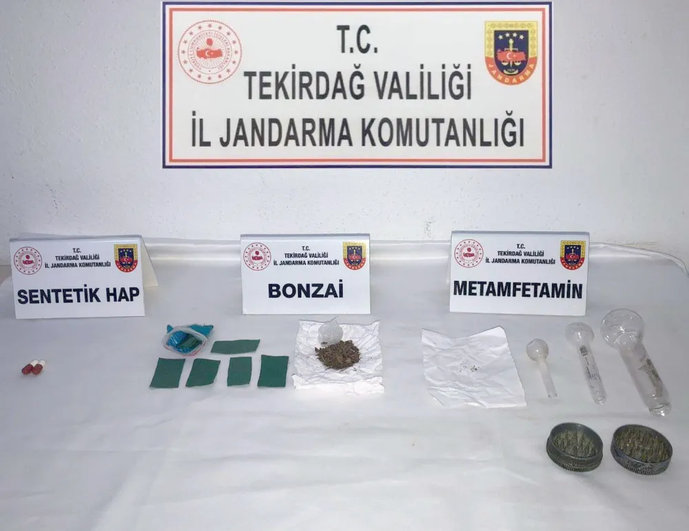 Süleymanpaşa ilçesi Çiftlikönü Mahallesi’nde U.C.U. isimli şahsın evinde ve aracında yapılan aramalarda, 23 adet peçeteye emdirilmiş bonzai, 1 gram bonzai, 1 gram metamfetamin, 2 adet sentetik ecza,1 adet kenevir öğütme aparatı, 3 adet uyuşturucu kullanma aparatı ele geçirildi.