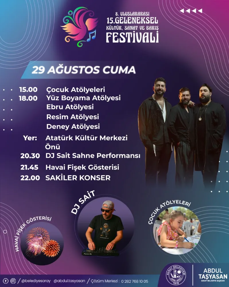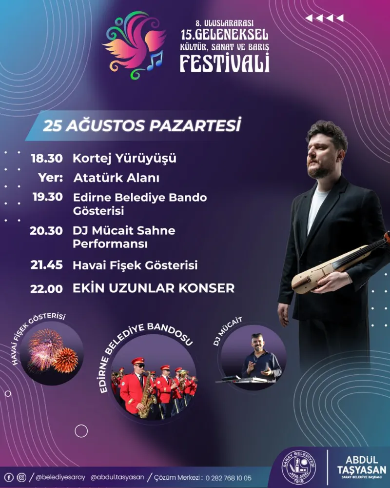 Saray Belediyesi 8. Uluslararası 15. Geleneksek Kültür, Sanat ve Barış Festivali 25 Ağustos Pazartesi günü başlıyor. Festivalin resmi açılışı 25 Ağustos Pazartesi günü saat 18.30’da Atatürk Alanı’nda gerçekleştirilecek. Festival çelenginin Atatürk Anıtı’na sunulmasıyla başlayacak olan program, kortej yürüyüşü sonrası Atatürk Kültür Merkezi önünde devam edecek. Edirne Belediye Bandosu gösterilerinin ardından DJ Mücahit sahne alacak. DJ Mücahit ardından ünlü sanatçı Ekin Uzunlar, en güzel şarkılarını Saraylılarla hep birlikte söyleyecek.