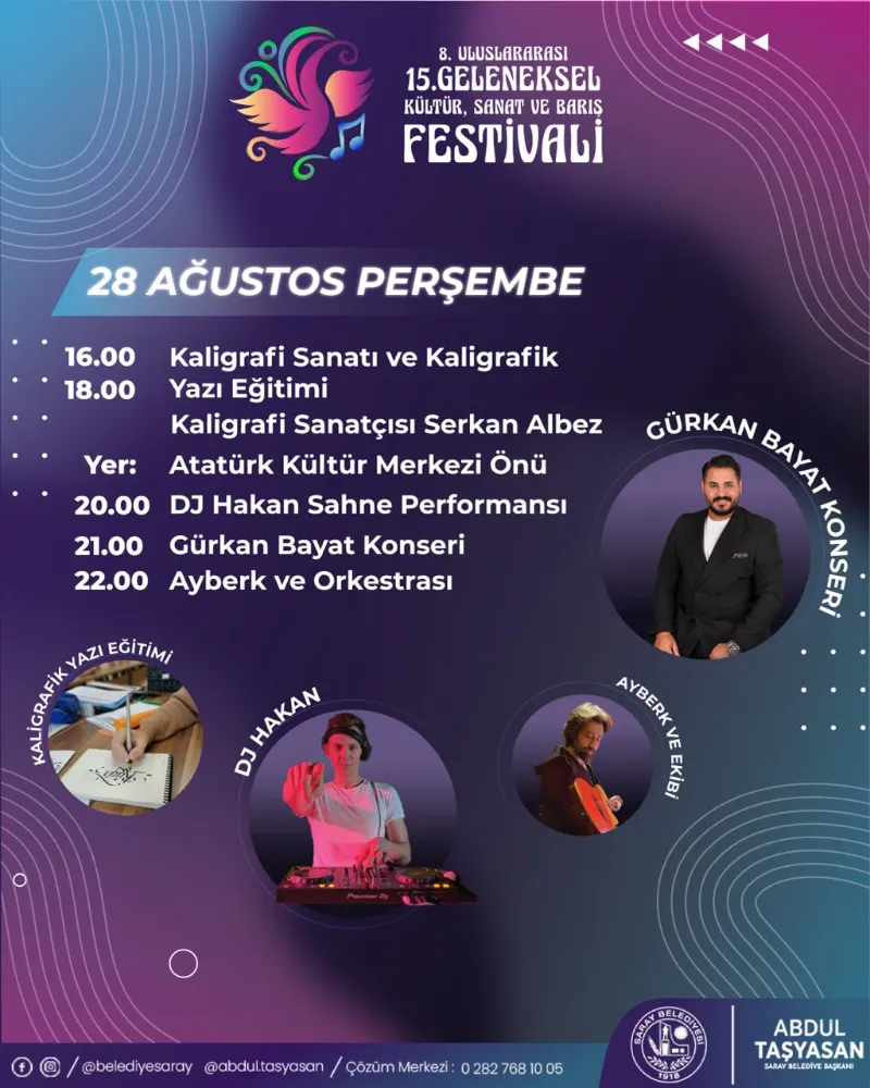 Saray Belediyesi 8. Uluslararası 15. Geleneksel Kültür, Sanat ve Barış Festivali 25- 30 Ağustos tarihleri arasında birbirinden renkli etkinliklere ve ünlü sanatçıların konserlerine ev sahipliği yapacak.