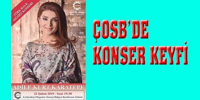 Türk Halk Müziğinin güçlü sesi Adile Kurt Karatepe, 21 Şubat 2019 Perşembe günü saat 19:30?da, Çerkezköy Organize Sanayi Bölgesi (ÇOSB) Konferans Salonunda konser verecek.