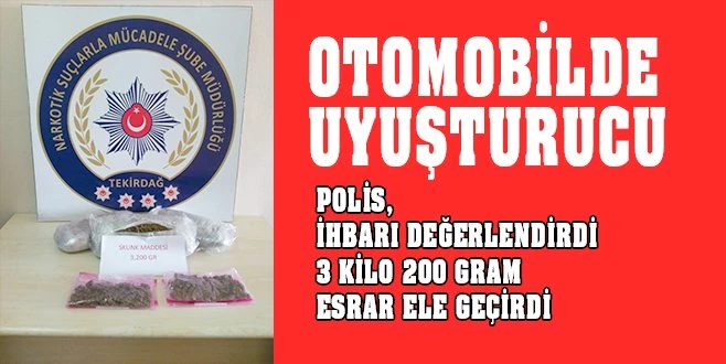 Ekipler, takibe alınan 35 ACD 402 plakalı otomobili, Malkara ilçesinde durdurdu. Araçta yapılan aramada, 3 kilo 200 gram skunk ele geçirildi. Sürücü K.K. gözaltına alındı.