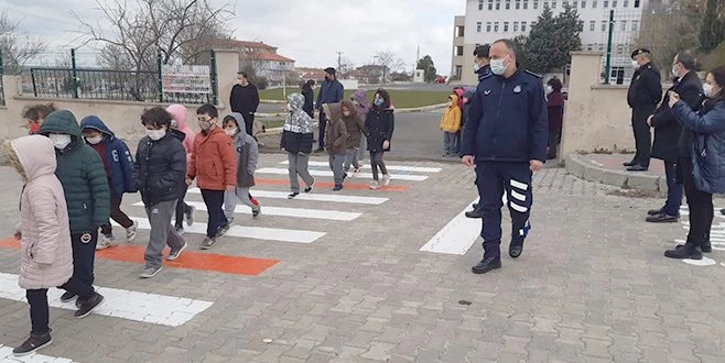 Ergene İlçe Jandarma Komutanlığı ve Ergene Belediyesi Zabıta Müdürlüğü ekipleri tarafından Ulaş Mahallesinde bulunan okulda küçük öğrencilere yaya geçidinden geçme kuralları hakkında bilgiler de verildi.