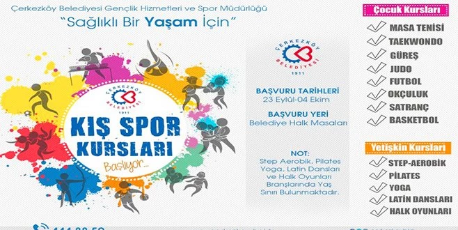 Bu yıl ilki gerçekleştirilecek olan Kış Spor Kursları için kayıtlar 23 Eylül ? 4 Ekim tarihleri arasında Çerkezköy Belediyesi Halk Masalarına yapılacağı bildirildi.