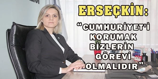 Cumhuriyetimizin kurucusu Ulu Önder Gazi Mustafa Kemal Atatürk?ün ?Cumhuriyet ilelebet payidar kalacaktır? sözünü hatırlatarak sözlerine başlayan Erseçkin; ?Asırlar boyunca bağımsız olarak yaşamış yüce Türk milletinin yeniden dirilişinin simgesi olan Cumhuriyetimizin kuruluşunun yıldönümünü kutlamanın coşkusunu ve heyecanını yaşıyoruz. Atamızın 1919 yılında yaktığı bağımsızlık ateşi bugün hala ilk günkü gibi yanıyor. Bağımsızlığımıza gölge düşürmeye çalışan emperyalist güçlere karşı el ele omuz omuza hep birlikte mücadele ederek, düşmanı ülkemizden kovan ve bize ?Cumhuriyet? gibi nesiller boyunca bizi ayakta tutan yönetim biçimini bize kazandıran Atamıza sonsuz saygı ve şükranlarımızı sunuyoruz. Cumhuriyet; aydınlığı, dostluğu, kardeşliği, birliği, beraberliği, barışı paylaşmaktır. Ulu önderimiz Gazi Mustafa Kemal Atatürk?ün ?En büyük eserim? diye nitelendirdiği Cumhuriyet`i korumak ve ilelebet yaşatmak bizlerin tek görevi olmalıdır. Cumhuriyetin anlam ve önemini çok iyi kavramak, Cumhuriyete ve Cumhuriyet değerlerine canımız pahasına sahip çıkmak, onları korumak görevimizi hakkıyla yerine getirmek mecburiyetindeyiz. Bu duygu ve düşüncelerle Cumhuriyetimizi bizlere kazandıran Atatürk başta olmak üzere, kurucu kahramanlara, vatan ve millet için hayatlarından vazgeçen aziz şehitlerimize Cenab-ı Allah`tan rahmet diliyorum. Cumhuriyet bayramımız kutlu olsun, ne mutlu Türküm diyene? dedi.