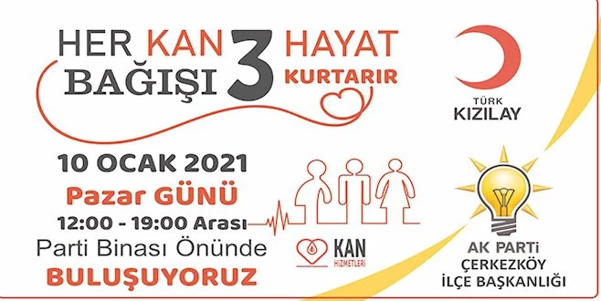 Pandemi döneminde Kızılay?ın kan stoklarının azalması nedeniyle kampanya başlatan AK Parti Çerkezköy İlçe Başkanı Çetintaş, ?10 Ocak Pazar Günü saat 12.00 -19.00 saatleri arasında Gazi Osman Paşa Mahallesi Atatürk Caddesi Atatürk Caddesi Atıntaş Plaza? bulunan ilçe binamızın önünde kan bağışı yapacağız. Siz vatandaşlarımızı da bekliyoruz. Kan bağışında bulunacak vatandaşlar, sokağa çıkma kısıtlamasından, bağış süresince muaf tutulacaktır? dedi.